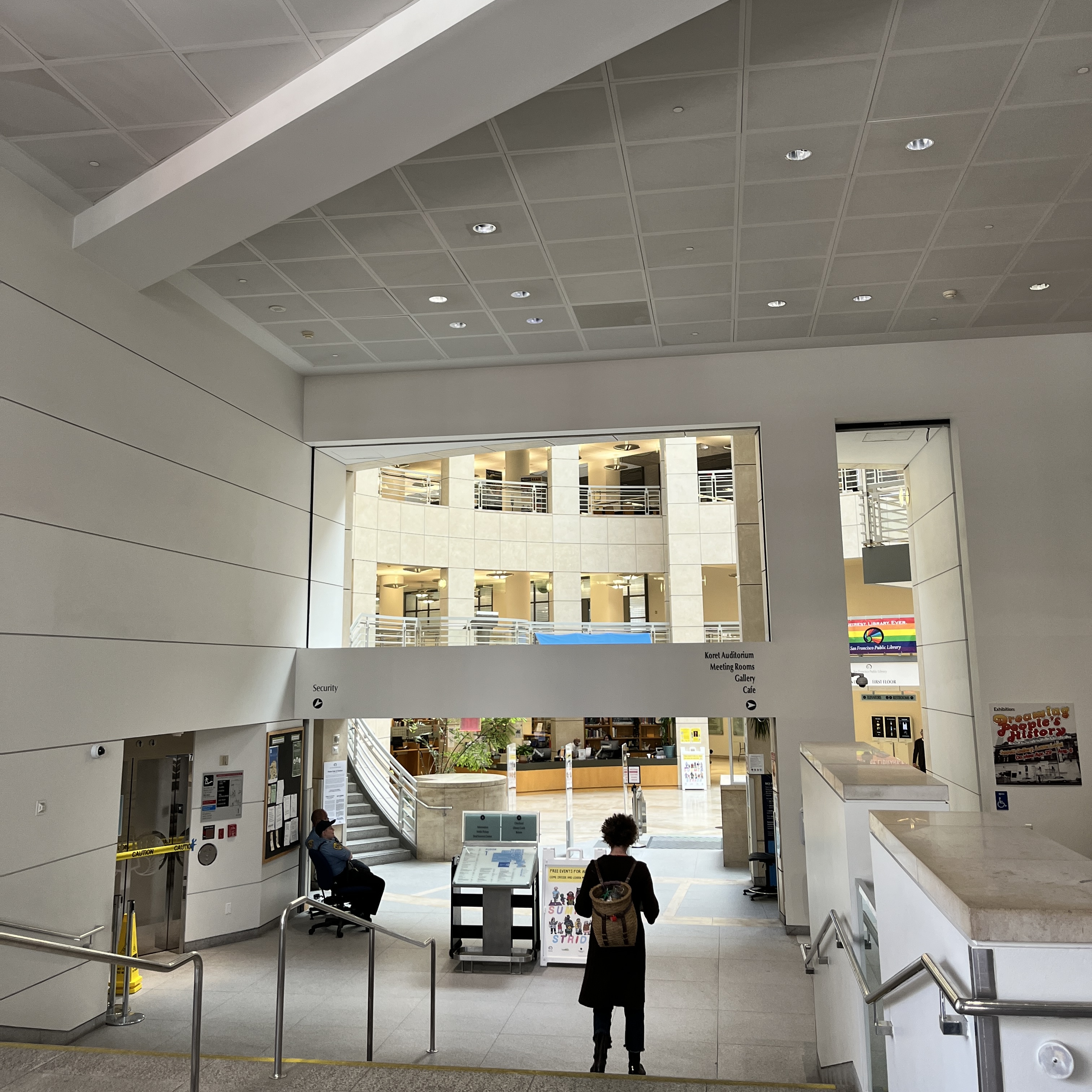 샌프란시스코 거리를 걸으며 다양한 노숙자들과 온갖 악취에 시달렸다면 도서관을 한 번 방문하는 것도 좋은 선택이 될 것이다. 겉으로 보기에 평범한 건물처럼 보이는 이 도서관은 내부에 들어서면 도서관이 공공커뮤니티시설로써 갖는 의미를 확인시켜 주듯 따뜻한 분위기를 풍긴다. 사진에서 보다시피 경비원이 입구를 상시 지키고 있기 때문에 노숙자 걱정은 하지 않아도 된다.