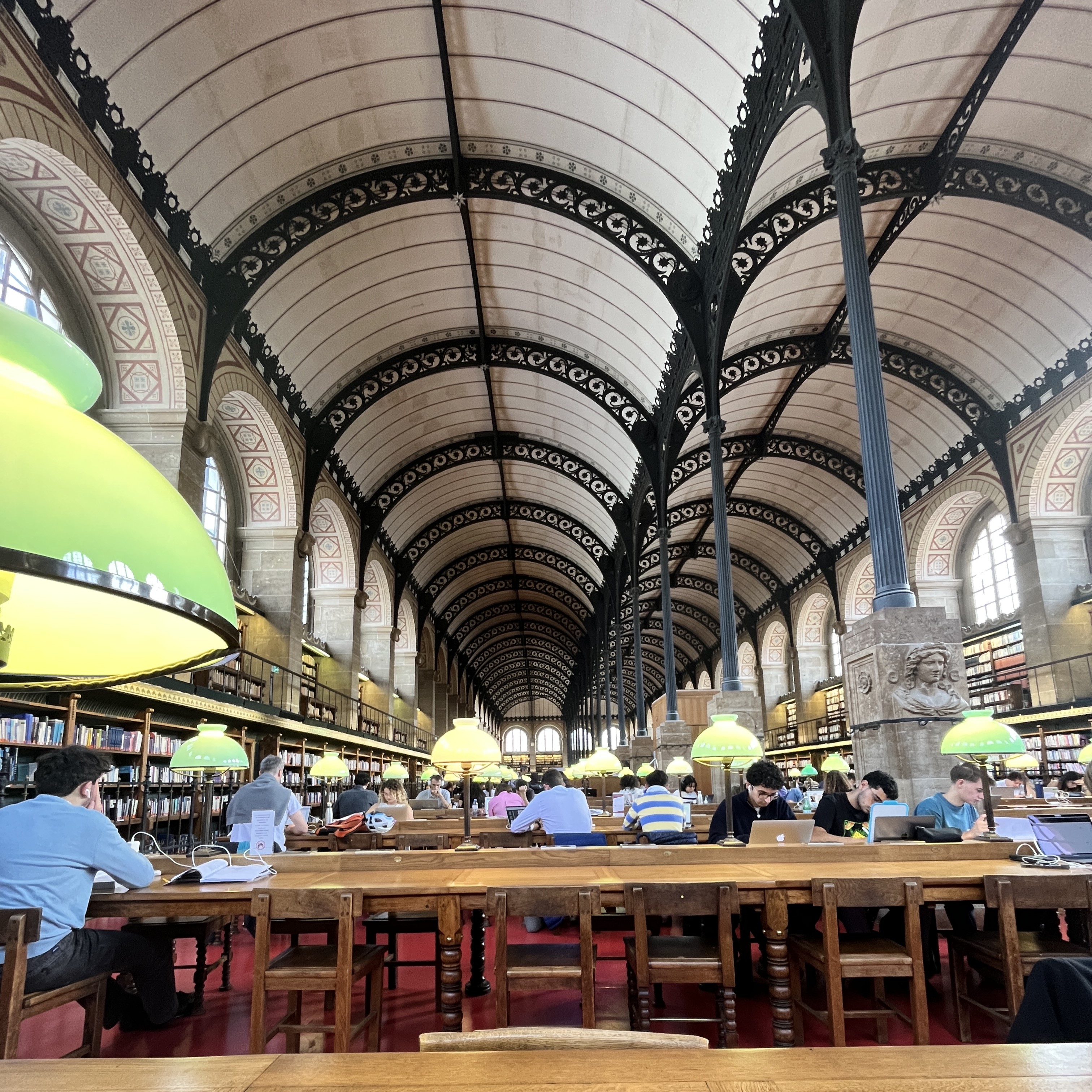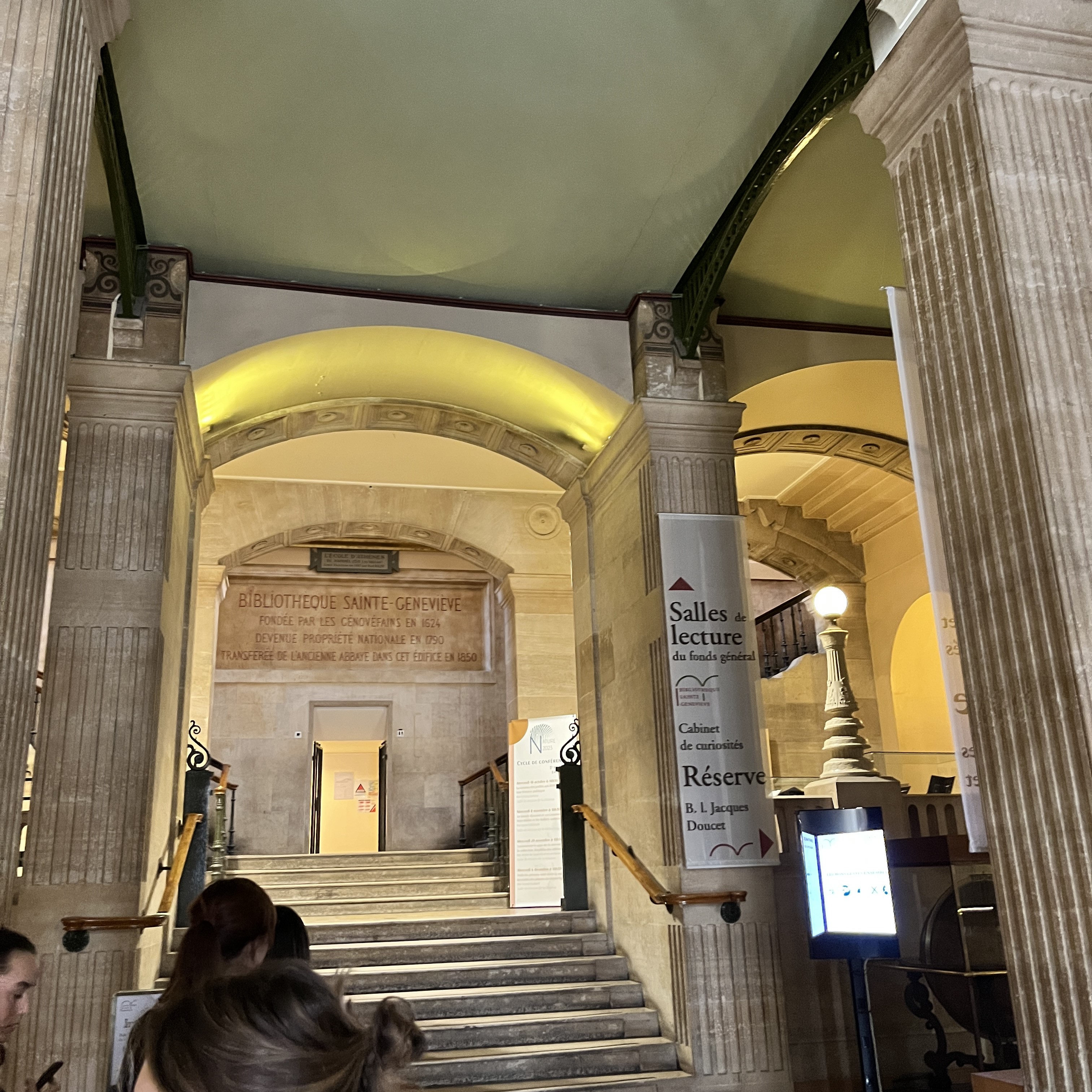 도서관 입구에 적힌 글이다. 번역에 따르면 1624년 Genovefains에 의해 설립되어 1970년 나라에 기부되었고 1850년 현재의 위치로 이전되었다고 적혀 있다. 내부 인테리어는 계속 바뀌었고 보수 공사도 했겠지만 이 건축물 자체는 170년이 넘은 셈이다. 간혹 20세기 초반에 쓰인 고전을 읽으면서 내가 상상할 수 없는 세상에서 살던 모르는 사람이 쓴 글을 나의 할아버지, 아버지 세대가 읽어왔고, 나도 읽었고, 앞으로 내 아들 세대까지 읽을 거라는 생각이 들면 아득한 느낌을 받을 때가 있다. 그런데 이 도서관은 무려 173년 전에 지어졌다. 물론 유럽에는 이보다 더 오랜 역사를 가진 건축물이 수두룩하지만 현재까지 사람들이 같은 용도로 사용하는 건축물은 드물지 않을까. 그때의 사람들도 이 자리에 앉아 책을 읽었고 현재의 나도 같은 자리에서 책을 읽고 있다는 생각이 들자 신비로운 기분이 들었다.
