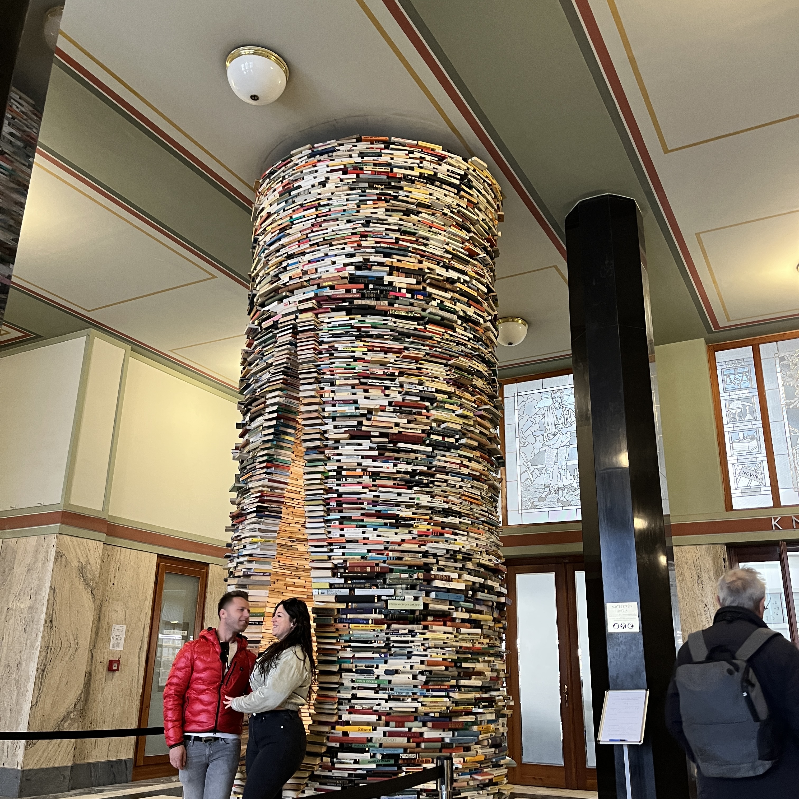 도서관 여는 시간에 맞춰 도착한 그 곳에서 나는 도서관 바깥으로 길게 늘어선 줄과 사람들에 당황했다. 도서관에 왜 이렇게 줄이 길지? 아직 도서관 문을 안 열었나? 나도 줄을 서야 하나? 회원 등록이 오래 걸리나? 이런저런 생각으로 도서관 입구 근처를 기웃거리다 보니 그 옆에 있는 사람들이 자유롭게 드나드는 또 다른 입구를 발견했다. 그리고 그 입구로 들어가자 그제야 많은 사람들의 정체를 알게 되었다. 바로 도서관 입구에 설치된 북타워(Idiom Book Tower)에서 사진을 찍기 위해 기다리는 여행자들이었다. 설명에 따르면 'Idiom'이라는 의미를 알 수 없는 이름을 가진 이 북타워는 1998년에 8,000권의 책을 쌓아 만들어졌다고 한다. 나는 도서관에 들어가기 위해 줄을 서지 않아도 된다는 사실에 안도했다. 그리고 그냥 지나가면서 봐도 될 것 같은데 굳이 줄을 서서 기다리는 사람들에 대한 의문도 생겼다. 나중에 알고 보니 북타워 내부에는 위아래로 거울이 설치되어 있어 갈라진 틈을 통해 안을 들여다보면 위아래로 끝없이 쌓인 책들을 볼 수 있다고 한다.(검색하면 멋진 사진들을 볼 수 있다.) 그제야 왜 이 북타워가 무한한 지식(Infinity of Knowledge)을 상징한다고 했는지 이해할 수 있었다. 하지만 그 한 장의 사진을 위해 기다려야 하는 줄이 사악하게 길었다.