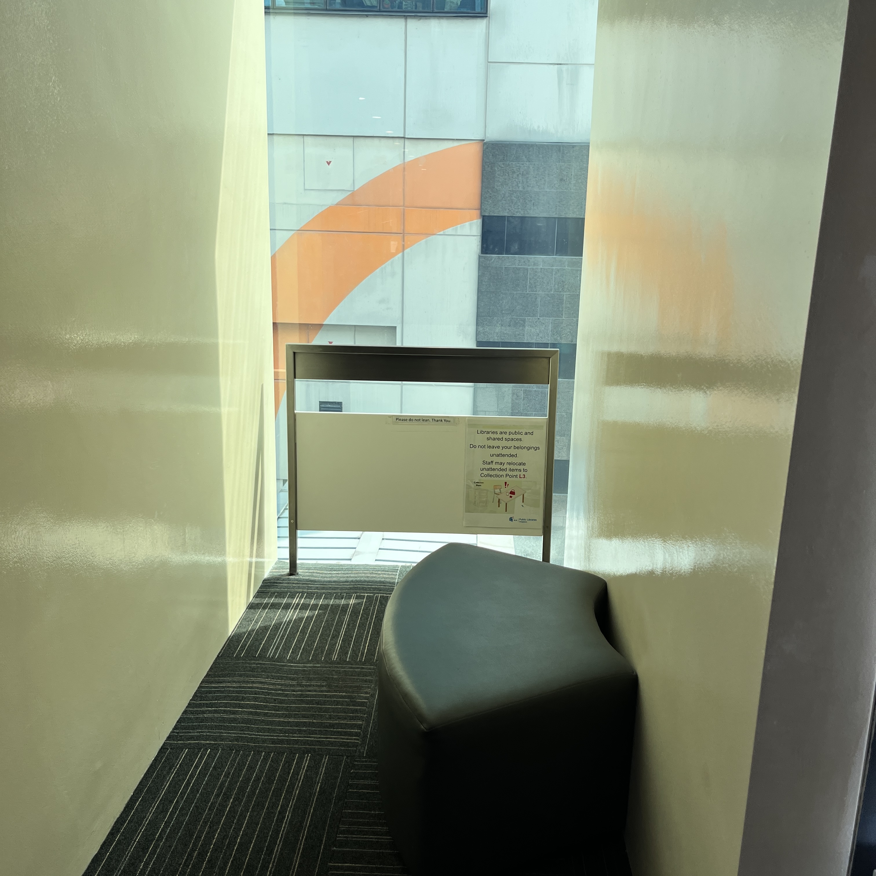 위 사진에 보이는 곳이 바로 바깥에서 봤을 때 초록색으로 튀어나온 공간이다. 도서관 내 설명에 따르면 조용한 사색을 위한 장소로 쓰인다고 되어 있긴 한데 생긴 걸로 보건대 조용하긴 하겠지만 오래 사색하기는 힘들 것 같았다. 그래도 자칫 따분하고 단조로울 수 있는 도서관에 이렇게 작은 공간으로나마 변화를 준 건 무척 좋아 보였다. 도서관에서 책을 읽거나 공부를 할 때 뭐랄까 가끔 잠깐이라도 혼자 있고 싶다는 생각이 들 때가 있다. 그럴 때면 나는 주로 도서관 바깥의 벤치에 혼자 앉아 있거나 매점 한 구석 의자에 앉아 있곤 했는데 그럴 때 저 공간에 앉아 창 밖을 바라보면 꽤 괜찮겠다 싶었다. 아니 어쩌면 앉아서 보이는 게 벽 밖에 없어서 더 답답하게 느껴지려나...