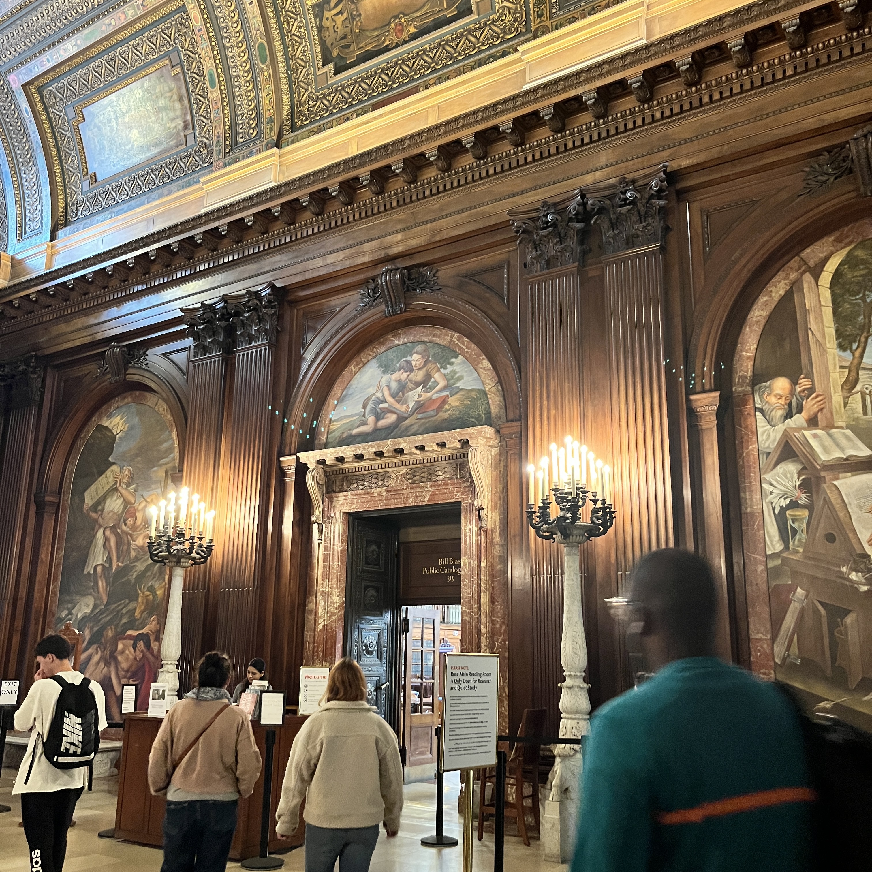 처음에 로즈 리딩룸에 들어갔을 때 순간 나는 유럽 어느 도시의 열람실에 들어간 것 같았다. 널찍한 나무 책상과 나무 의자, 앤틱한 인테리어, 높은 층고와 천장에 그려진 벽화가 이질적으로 느껴졌다. 고작 몇 분 전만 해도 고층 빌딩과 교통 정체, 현대적인 건물들로 둘러싸인 자본주의의 상징과도 같은 맨해튼에 있었는데 갑자기 이렇게 따뜻한 공간이라니? 잠시 여기에 앉아 주위를 둘러보았다. 흔히 뉴요커 하면 차가운 도시인의 이미지인데 이곳에 앉아 책을 읽고 공부를 하는 뉴요커들은 모두가 순하고 따뜻한 사람 같았다. 로즈 리딩룸은 모든 사람에게 무료 개방이긴 하지만 순수한 공부 목적을 위해서만 입장이 가능하다. 나는 이 사실을 나중에 알게 되었는데 입장 당시에 아무런 제지가 없었던 걸 보면 나에게서 순수한 공부 목적 외 다른 목적은 찾아볼 수 없었나 보다. 좋은 건지 나쁜 건지? 또 팁 하나만 적자면 열람실 내부가 무척 춥다. 천장에서 에어컨 바람이 무지막지하게 내려오는데 어느 자리에 앉아도 그 서늘한 바람을 피하기 어렵다. 그래서 여름이나 가을에 가더라도 외투를 꼭 챙겨가는 것이 좋을 것 같다. 어마어마한 뉴욕의 시차 공격 때문에 정오를 넘기지 못하고 다시 호텔로 돌아오기는 했지만 차가운 맨해튼 속 따뜻한 공간으로 기억될 것 같다.
